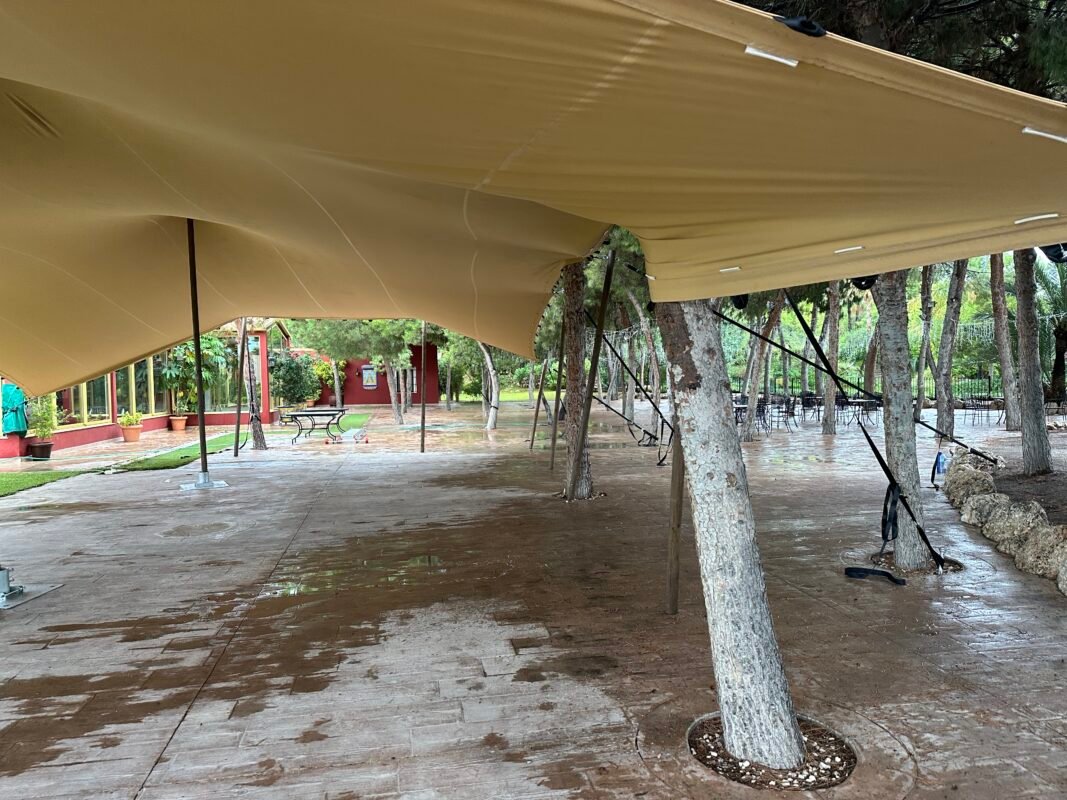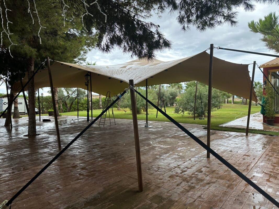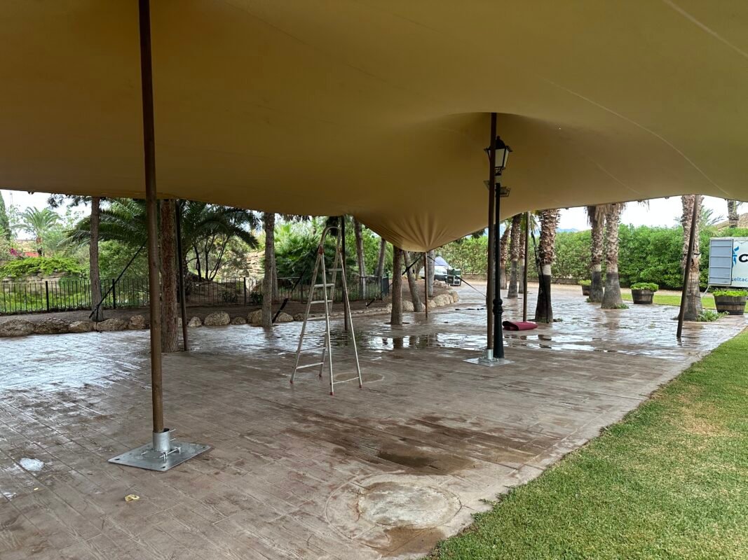 Lejos de ser un obstáculo, nuestro equipo convirtió esta dificultad en un detalle decorativo, adaptando la lona para rodear la farola con precisión y mantener la tensión correcta de toda la estructura.