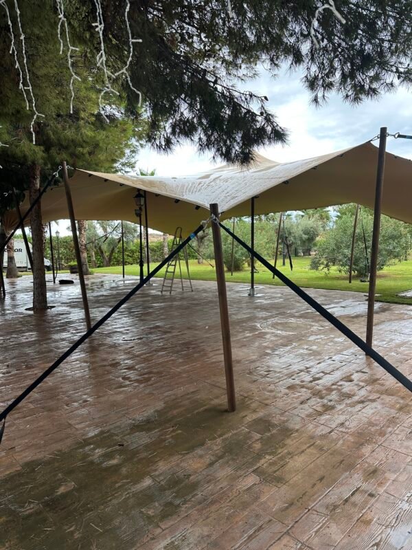 A diferencia de las carpas tradicionales, su lona elástica permite crear formas curvas y naturales que se adaptan al terreno, a los árboles o incluso a elementos fijos como postes o farolas.