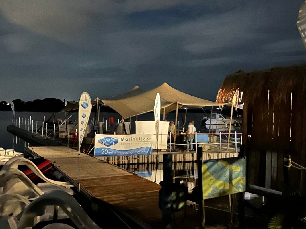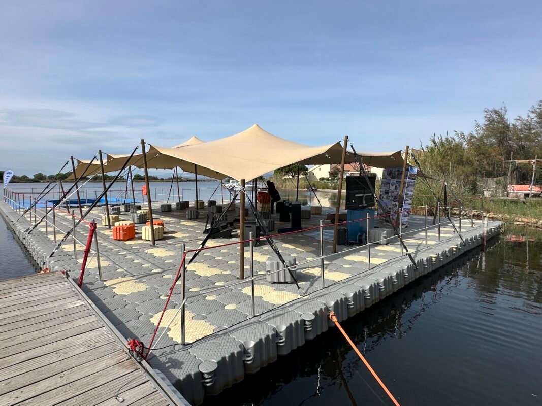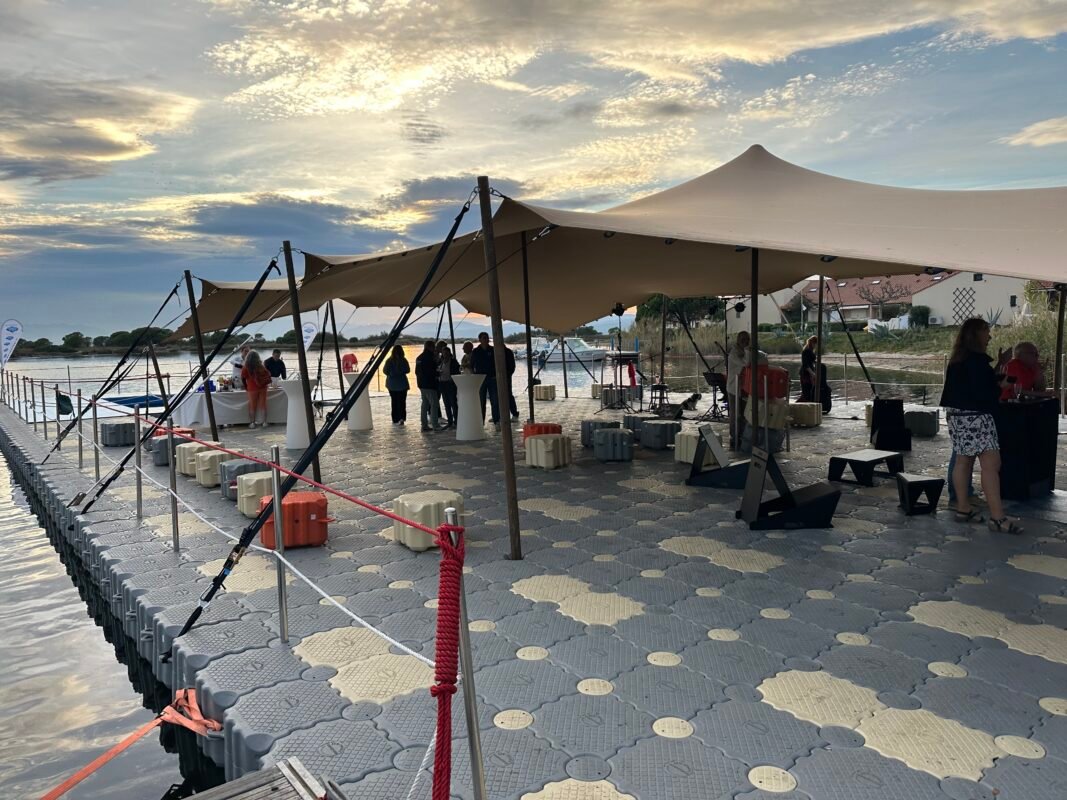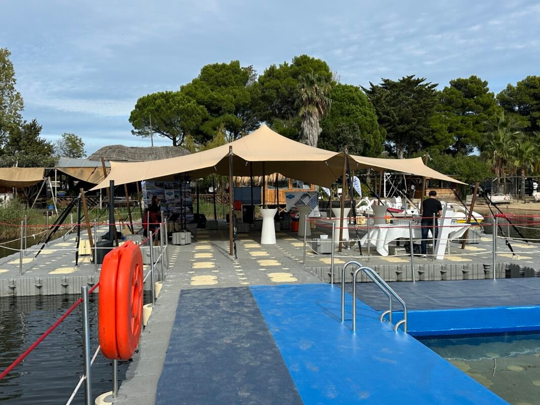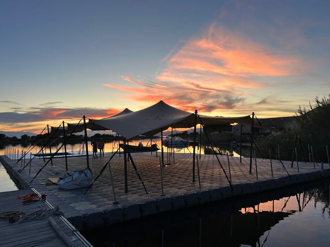 El montaje tuvo lugar en Port Leucate, Francia, un enclave natural rodeado de agua y vegetación. El principal desafío fue instalar una carpa stretch sobre una plataforma marina, garantizando seguridad, estabilidad y una estética impecable.
