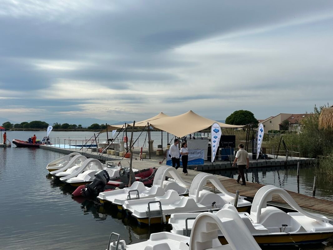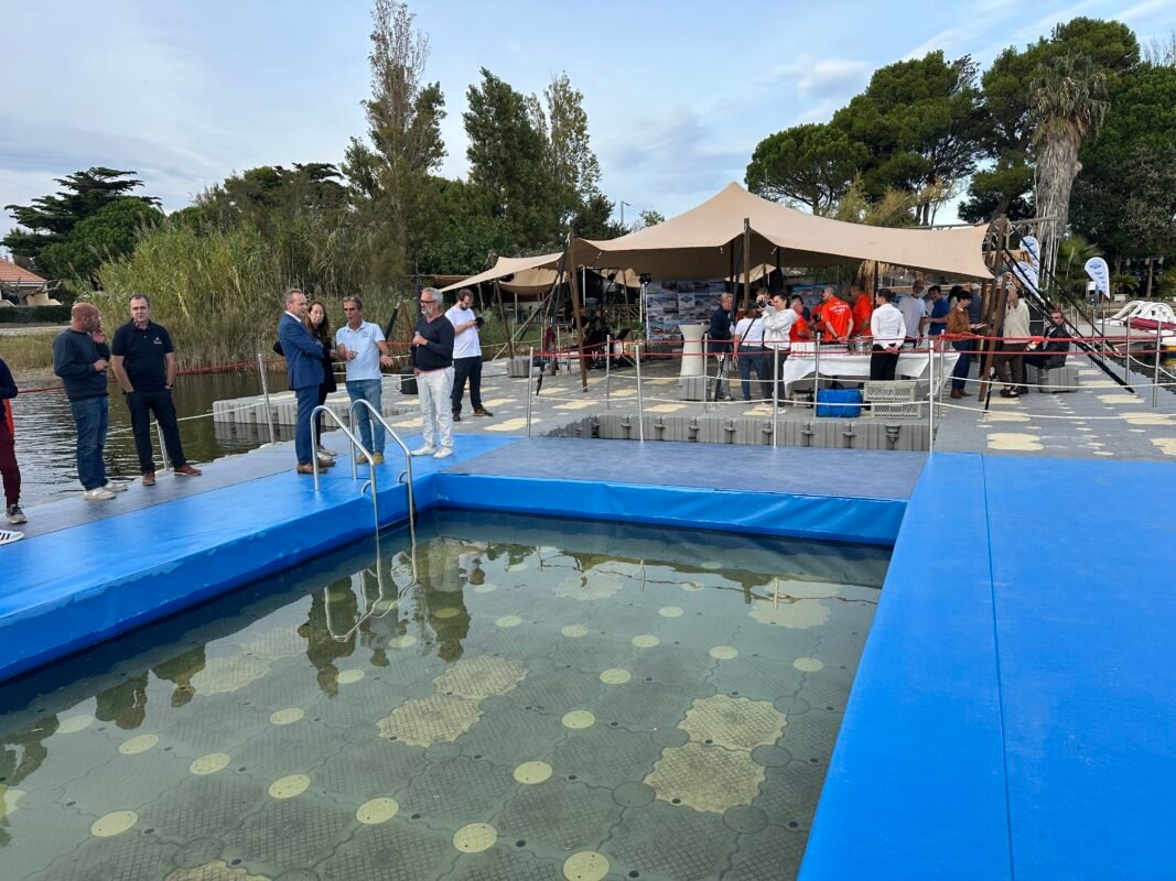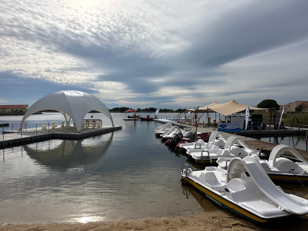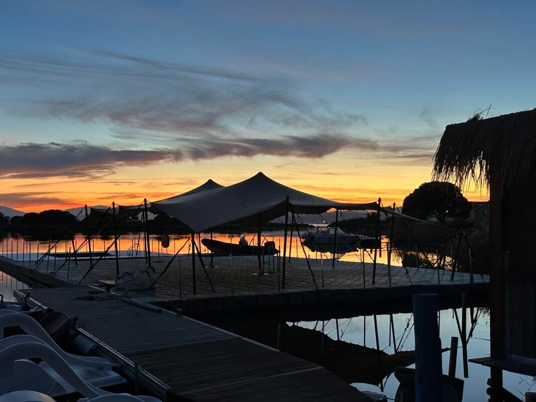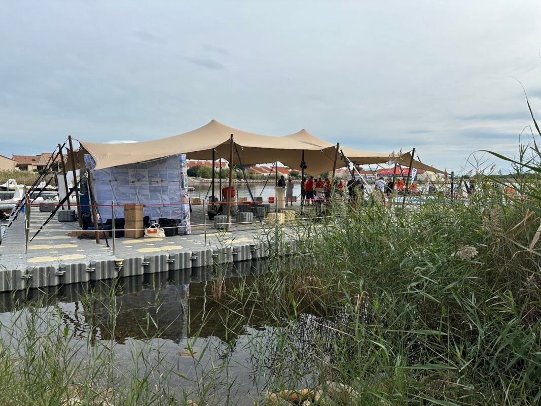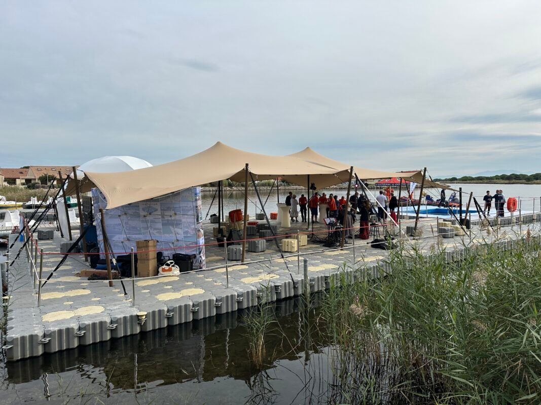 El montaje tuvo lugar en Port Leucate, Francia, un enclave natural rodeado de agua y vegetación. El principal desafío fue instalar una carpa stretch sobre una plataforma marina, garantizando seguridad, estabilidad y una estética impecable.