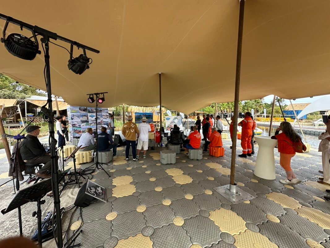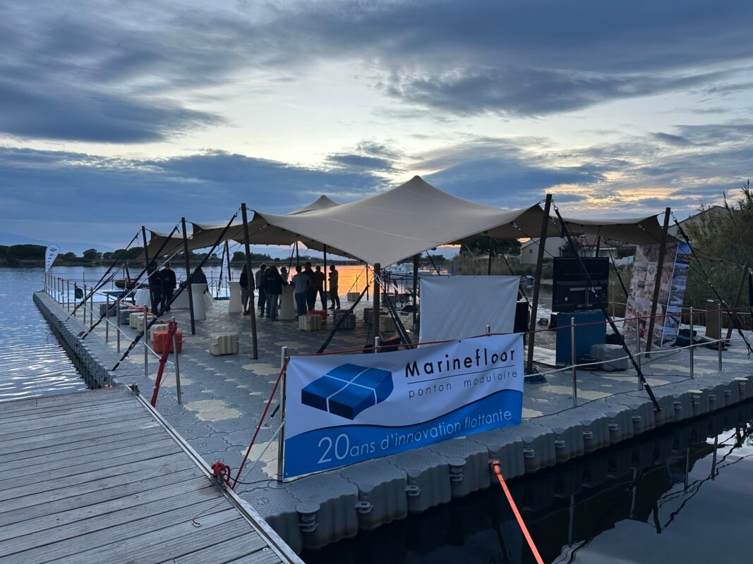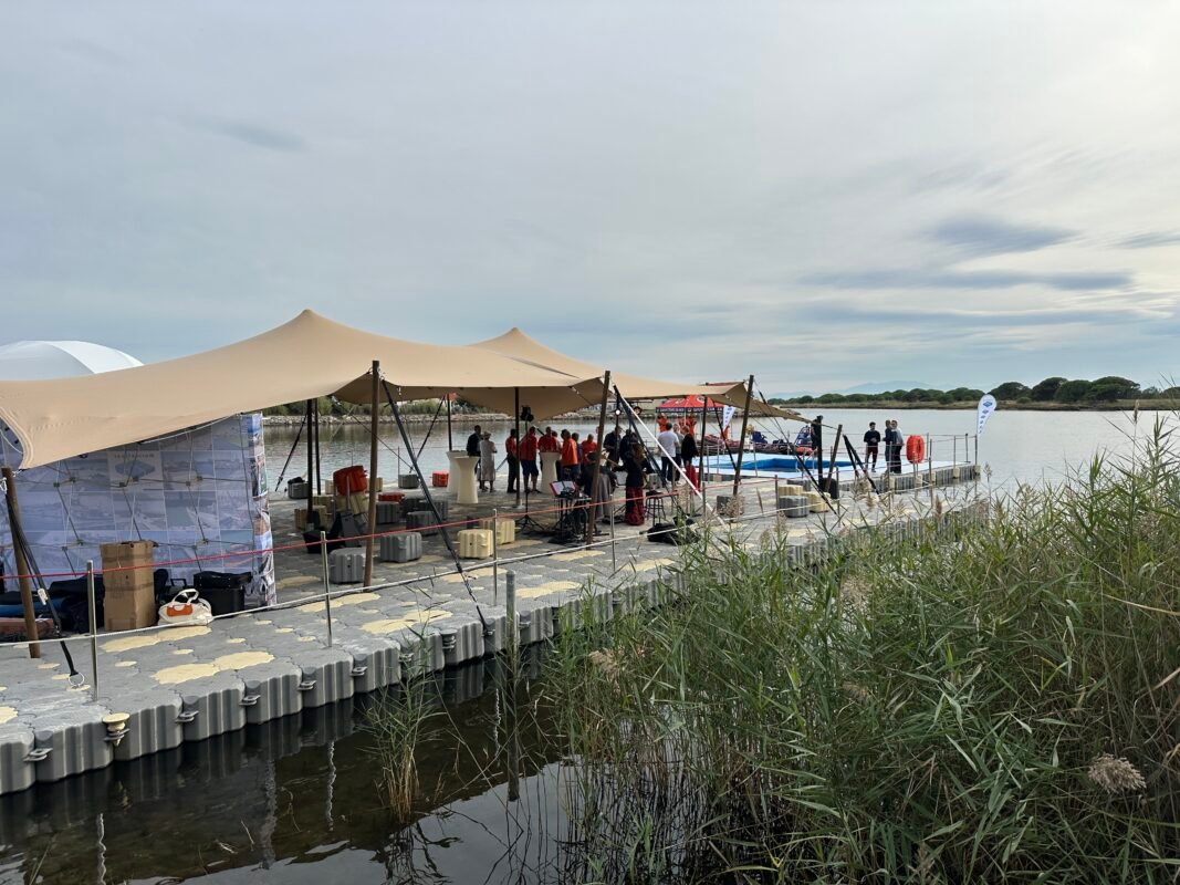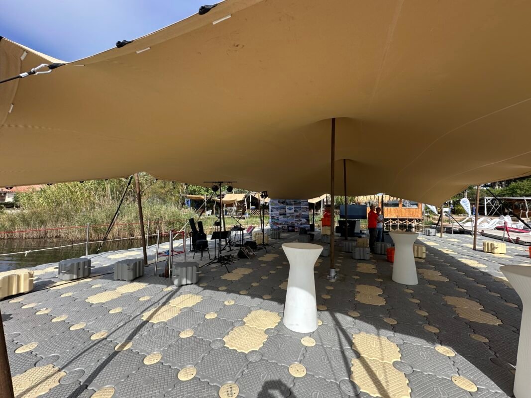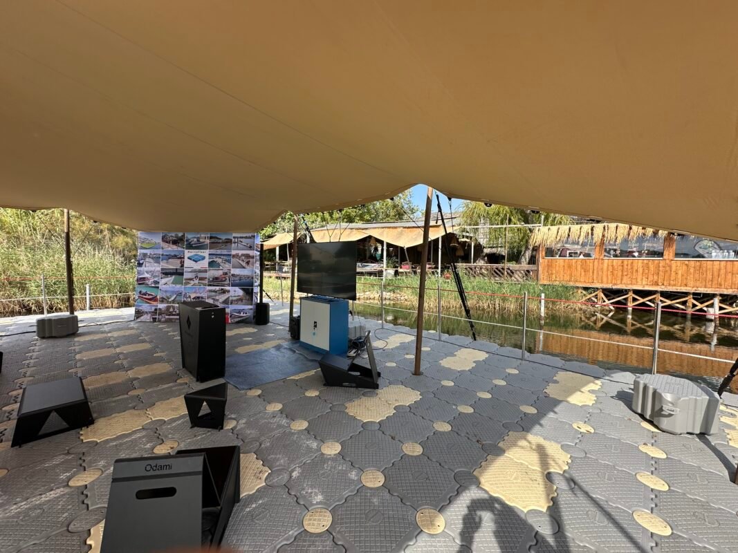 El proyecto se realizó en colaboración con la compañía Marine Floor, referente europeo en plataformas modulares flotantes. La estructura sirvió de espacio principal para un evento corporativo celebrado sobre el agua, combinando elegancia, funcionalidad y un entorno natural excepcional.