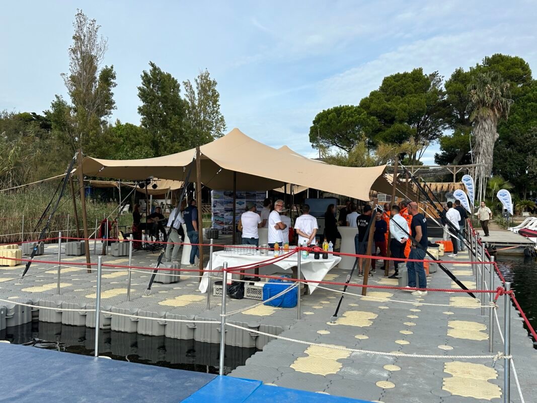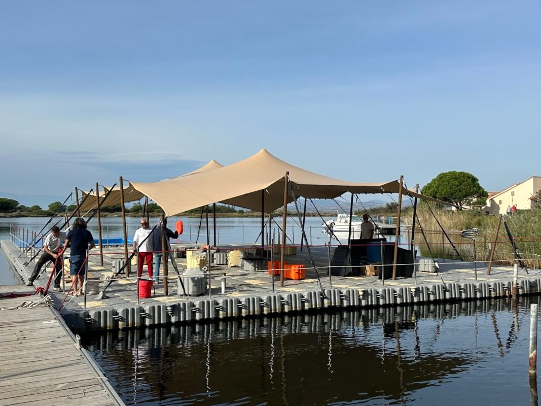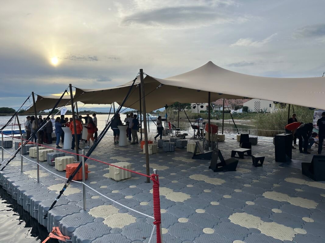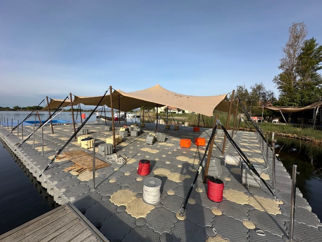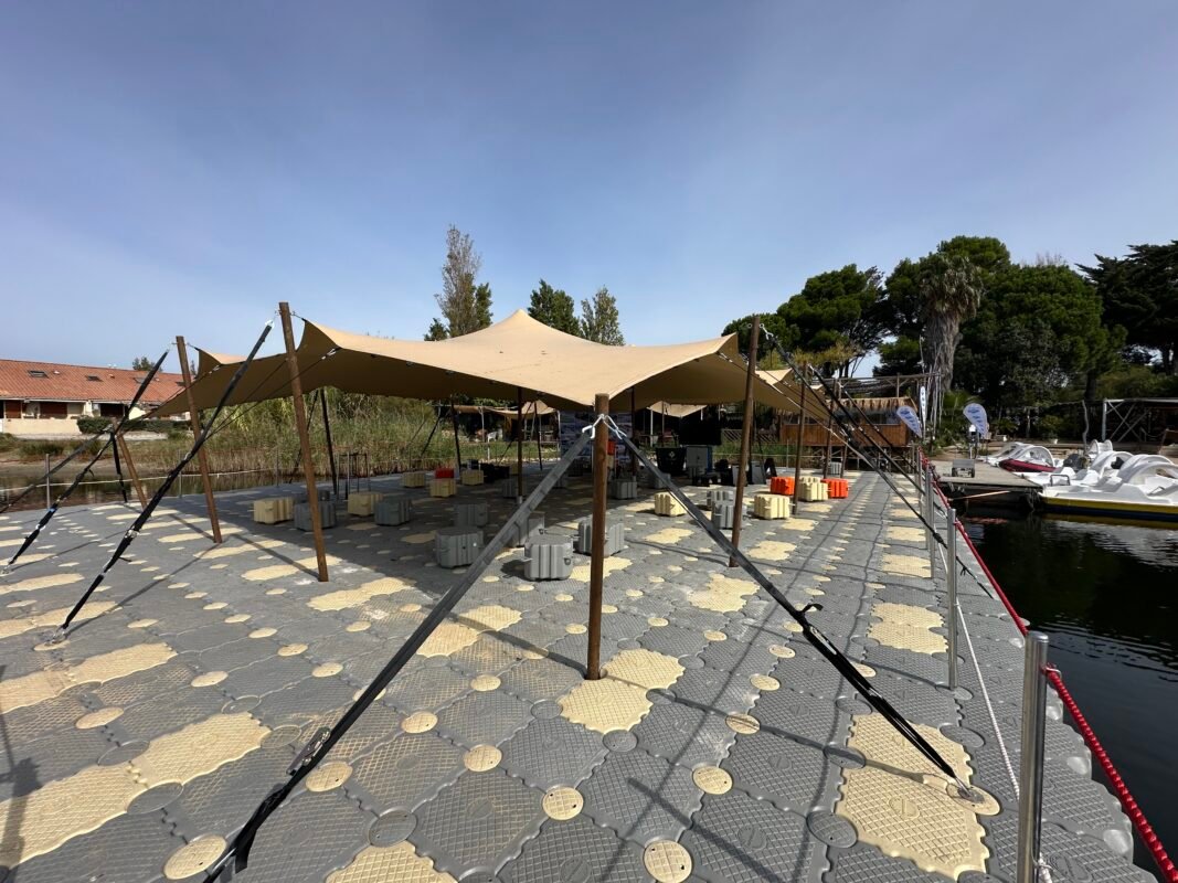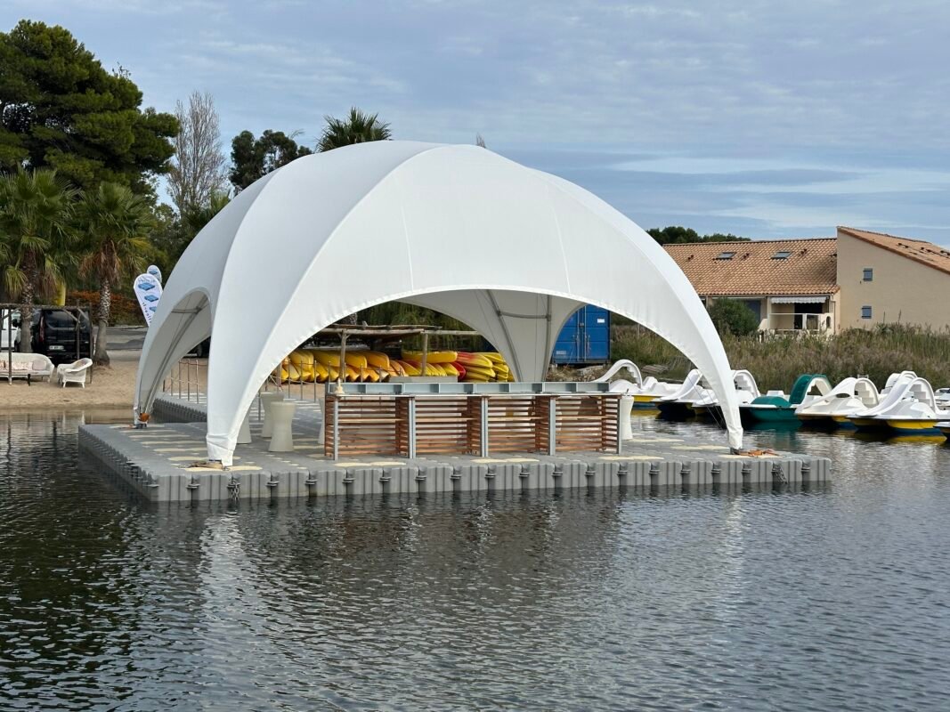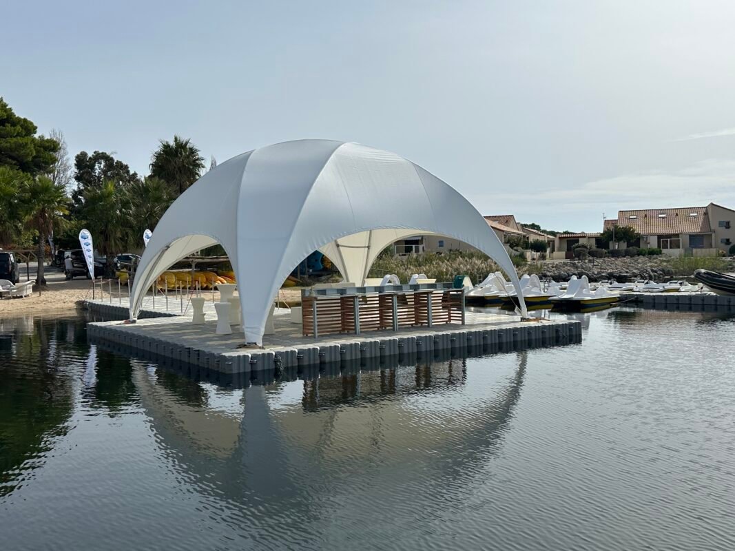 La empresa alicantina Cerramientos Arkia, especializada en estructuras para eventos y espacios exteriores, ha llevado a cabo una de sus instalaciones más destacadas del año: el montaje de una carpa stretch o carpa beduina sobre una plataforma flotante en la localidad francesa de Port Leucate.