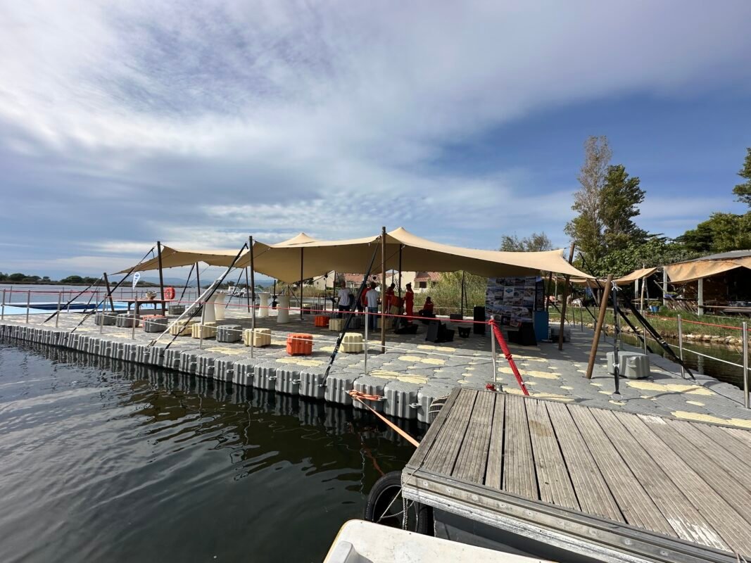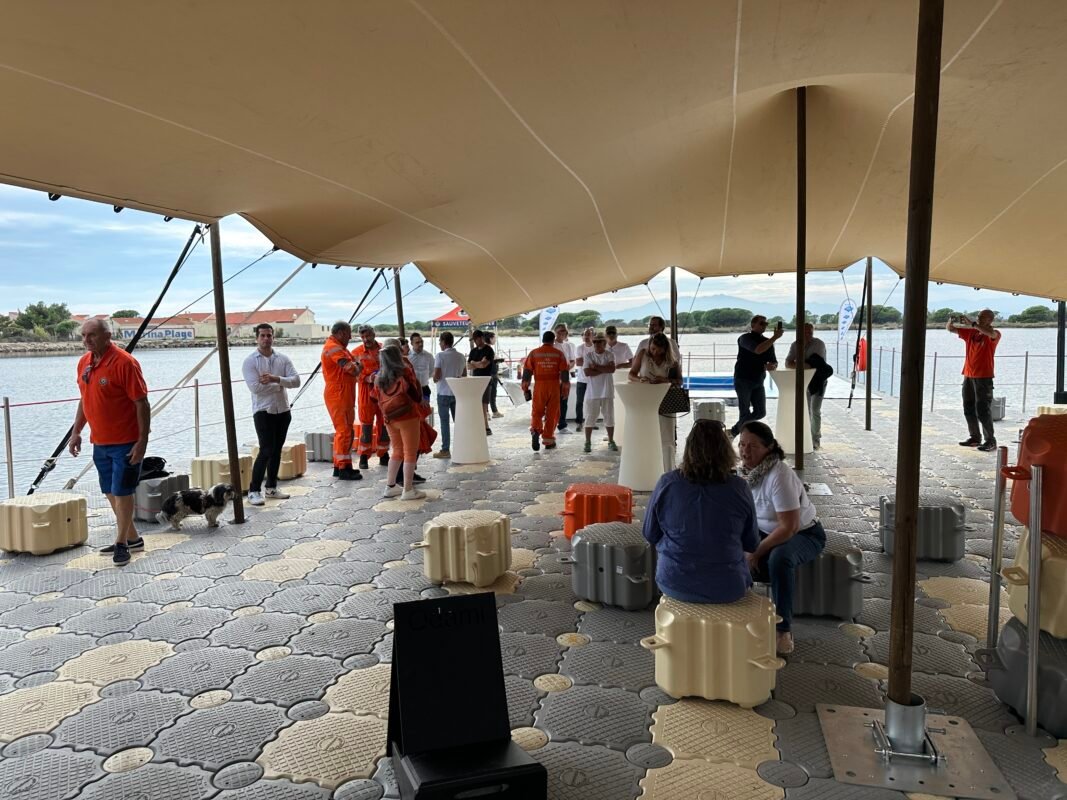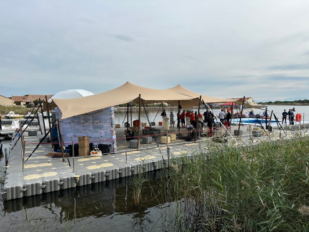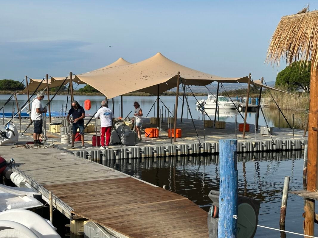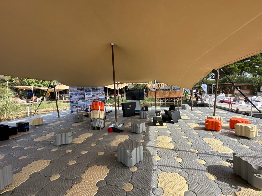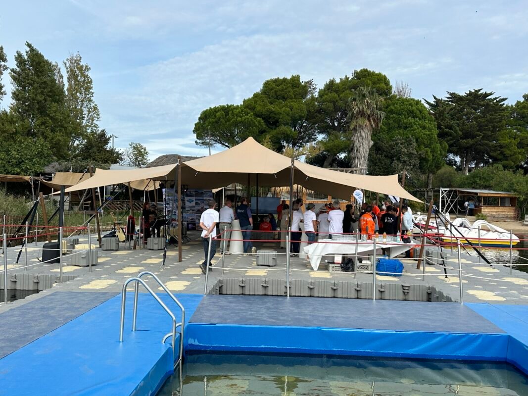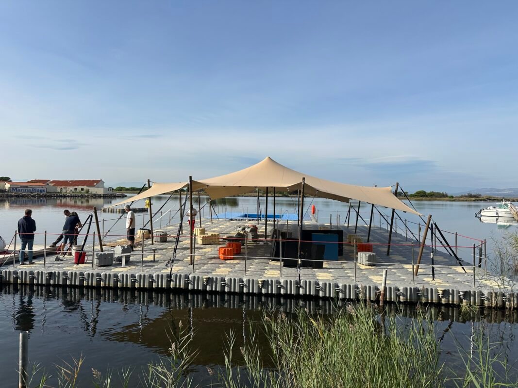 La empresa alicantina Cerramientos Arkia, especializada en estructuras para eventos y espacios exteriores, ha llevado a cabo una de sus instalaciones más destacadas del año: el montaje de una carpa stretch o carpa beduina sobre una plataforma flotante en la localidad francesa de Port Leucate.