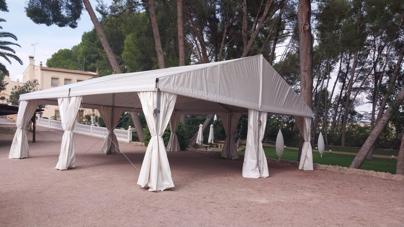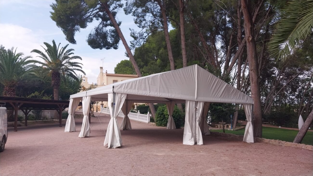 Nuestro equipo técnico se encargó de todo el proceso, desde la planificación del montaje hasta el ajuste final de cada detalle. La carpa a dos aguas no solo ofreció un entorno espectacular, sino también seguridad, resistencia y elegancia, cumpliendo con los estándares más exigentes del sector de eventos y bodas.