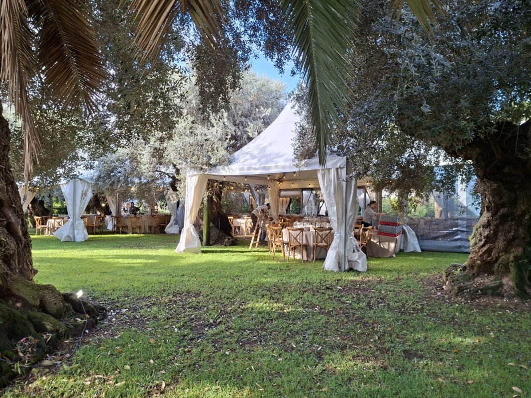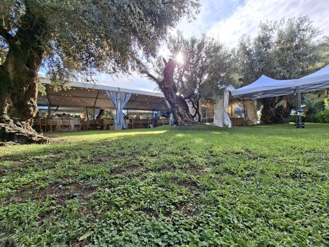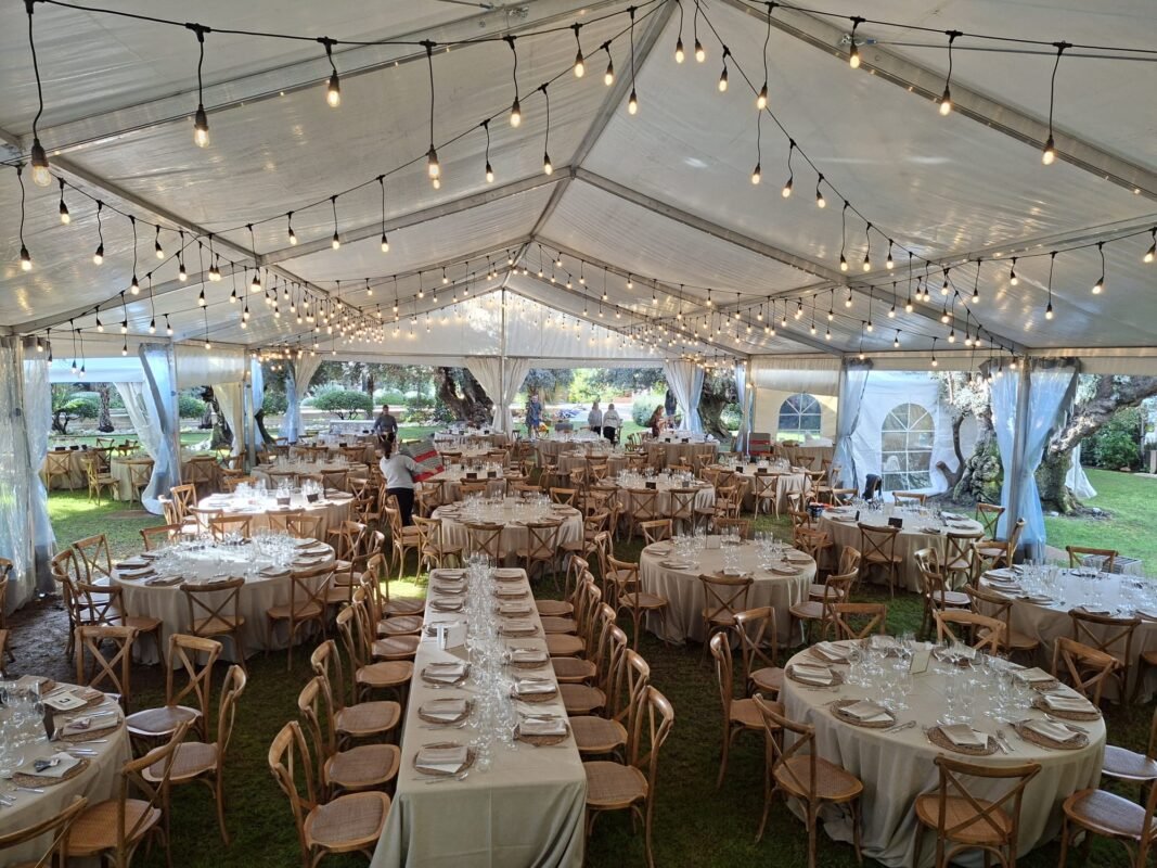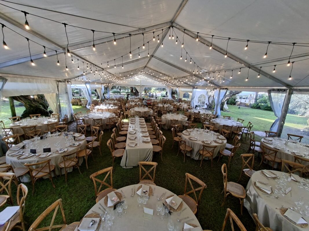 Bajo la sombra de los olivos, los invitados disfrutaron de una jornada inolvidable. La carpa transparente permitió aprovechar al máximo la luz natural durante el día, mientras que, al caer la noche, la iluminación ambiental realzó la belleza del entorno y la elegancia del montaje.