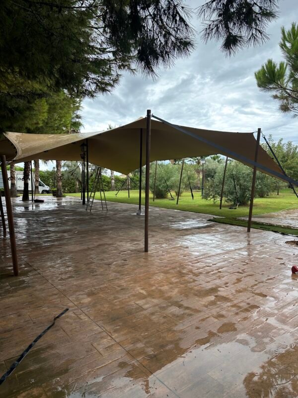 Lejos de ser un obstáculo, nuestro equipo convirtió esta dificultad en un detalle decorativo, adaptando la lona para rodear la farola con precisión y mantener la tensión correcta de toda la estructura.