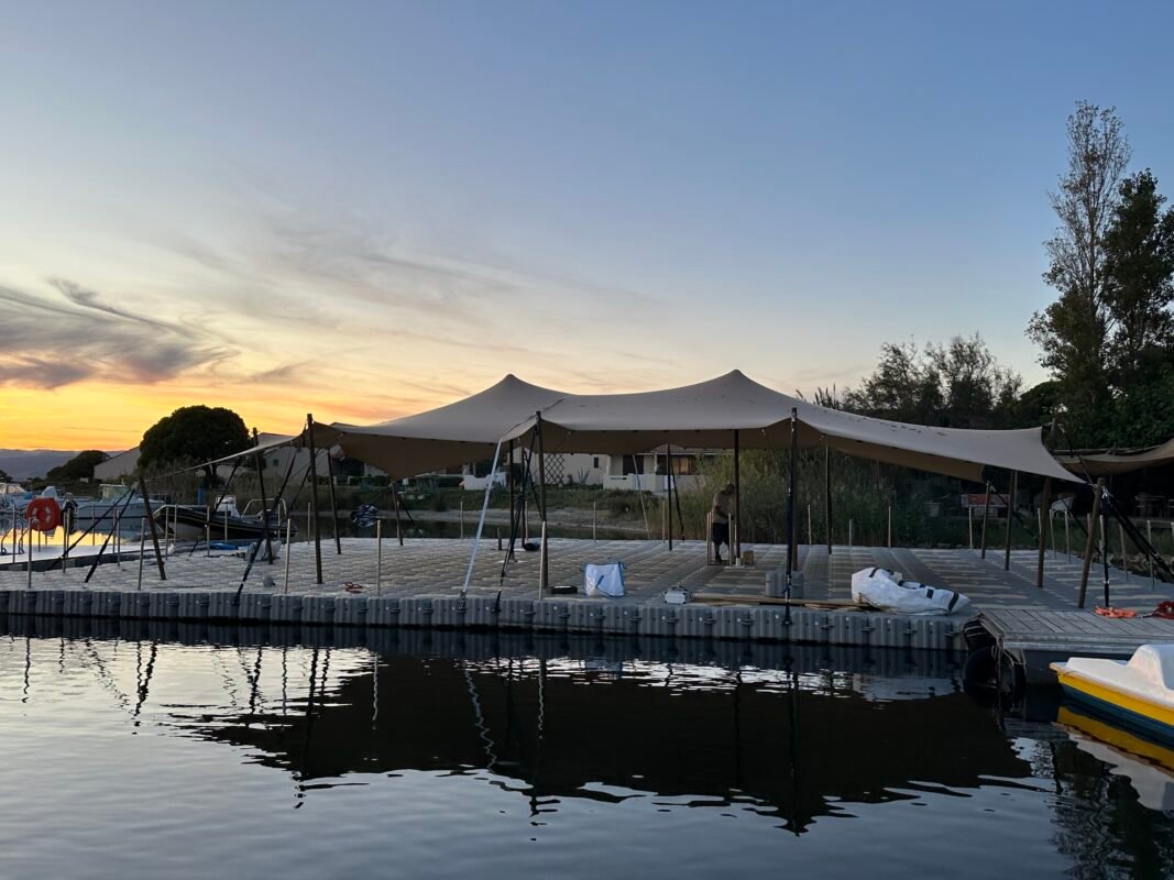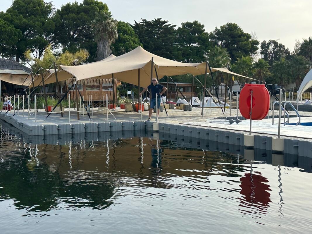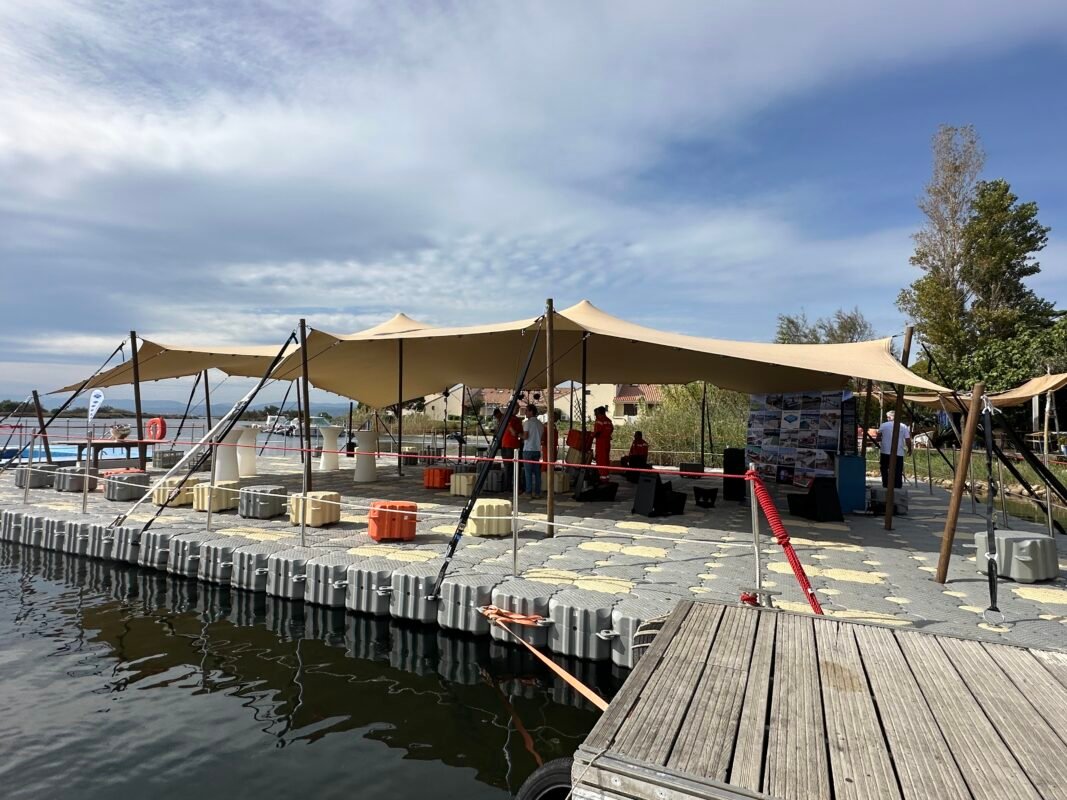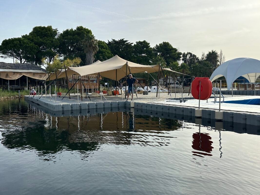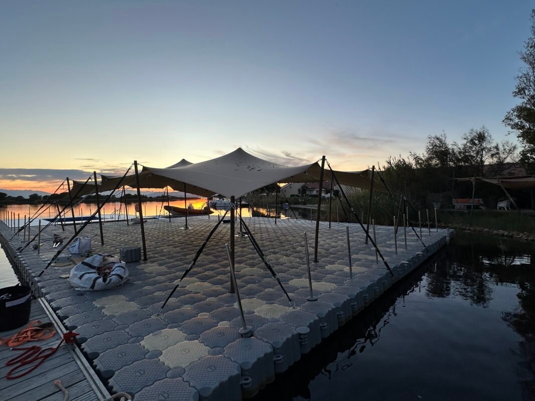 La empresa alicantina Cerramientos Arkia, especializada en estructuras para eventos y espacios exteriores, ha llevado a cabo una de sus instalaciones más destacadas del año: el montaje de una carpa stretch o carpa beduina sobre una plataforma flotante en la localidad francesa de Port Leucate.