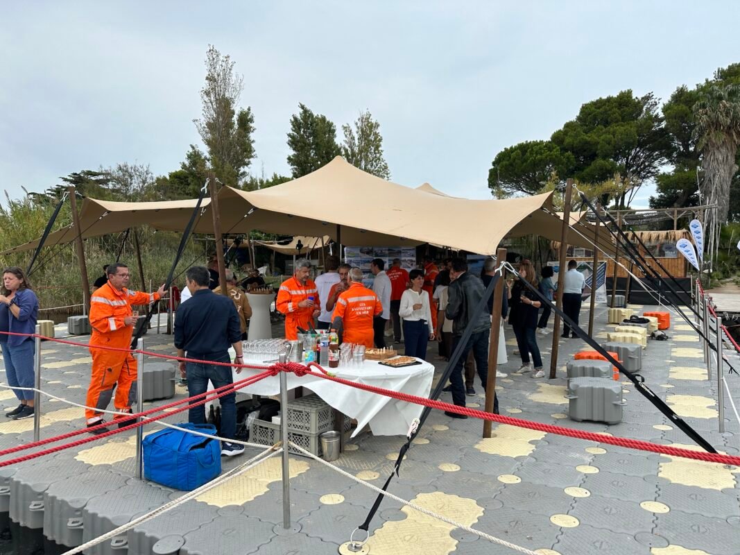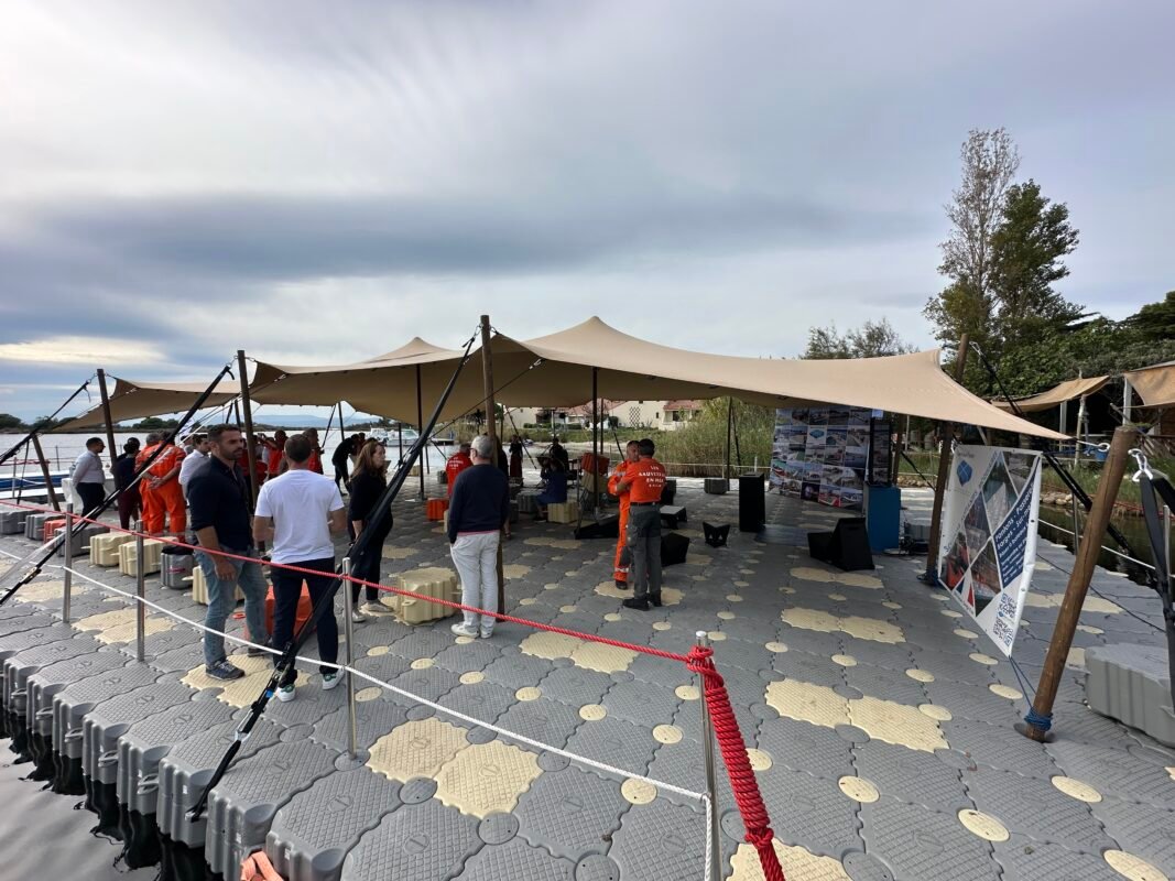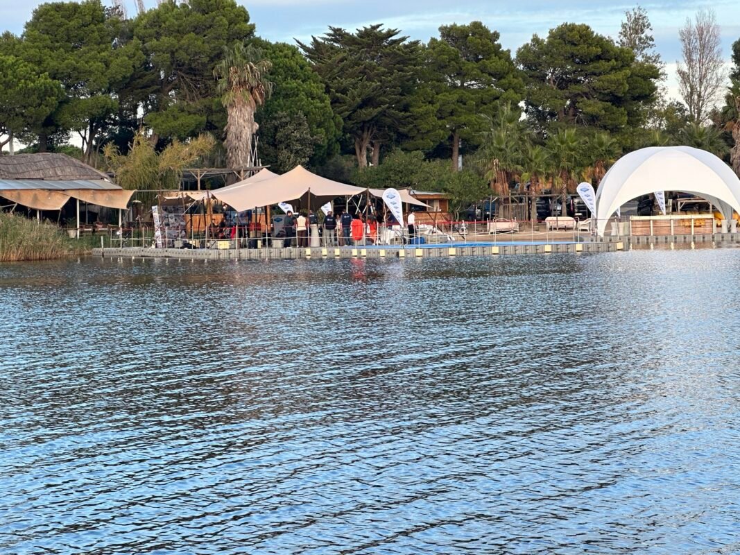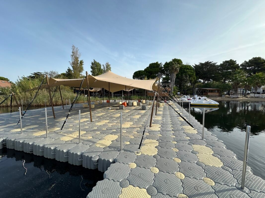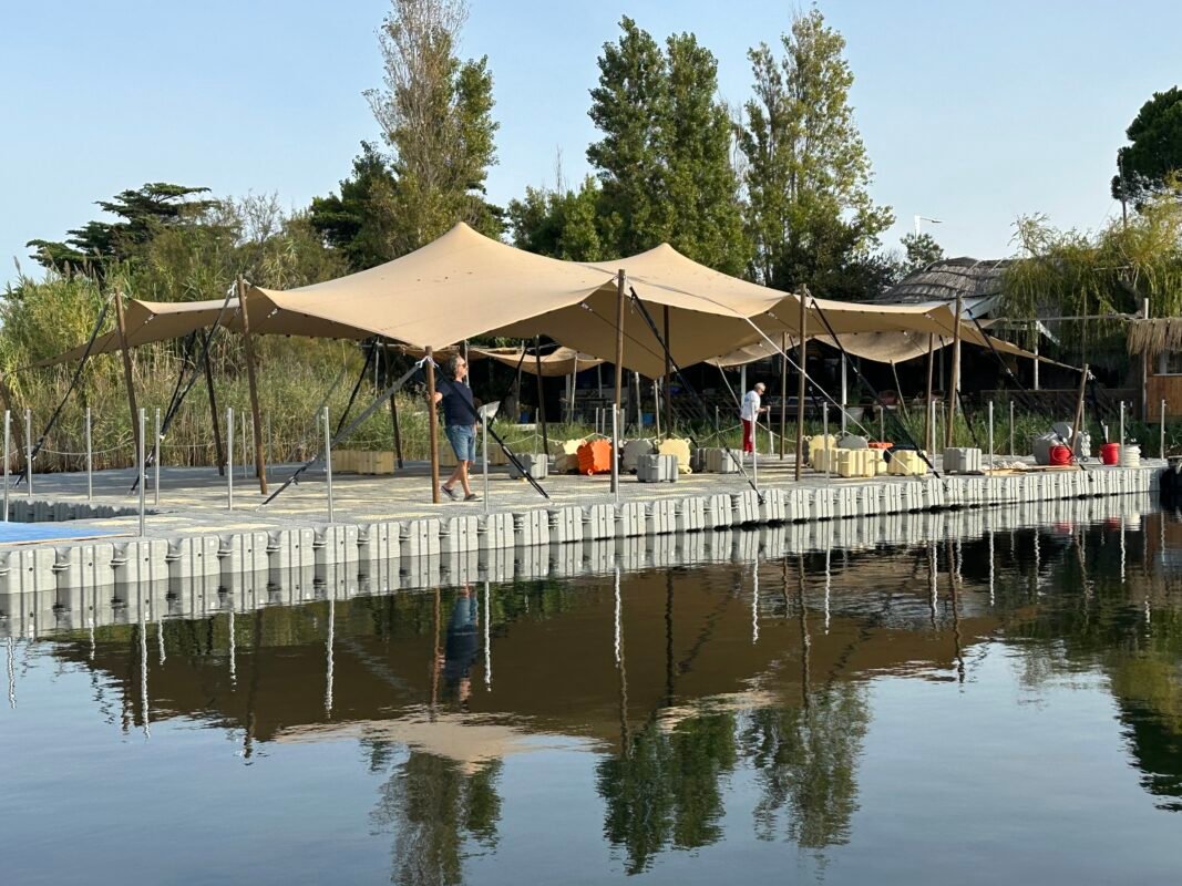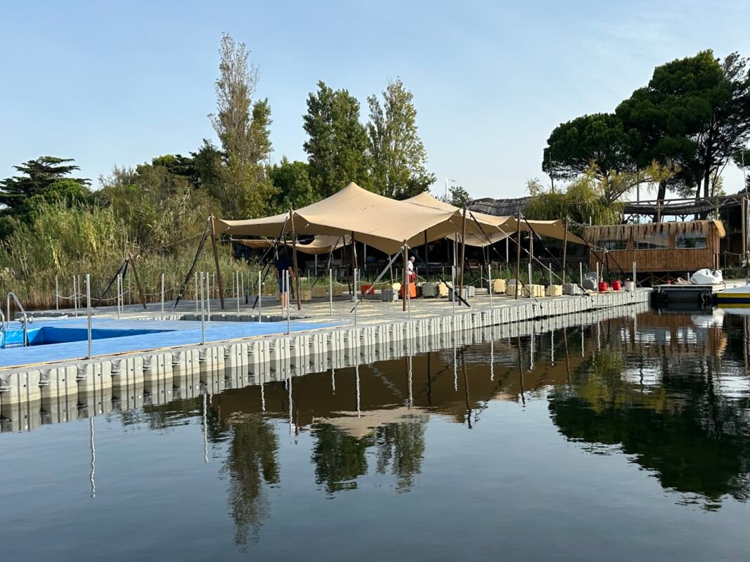 La empresa alicantina Cerramientos Arkia, especializada en estructuras para eventos y espacios exteriores, ha llevado a cabo una de sus instalaciones más destacadas del año: el montaje de una carpa stretch o carpa beduina sobre una plataforma flotante en la localidad francesa de Port Leucate.