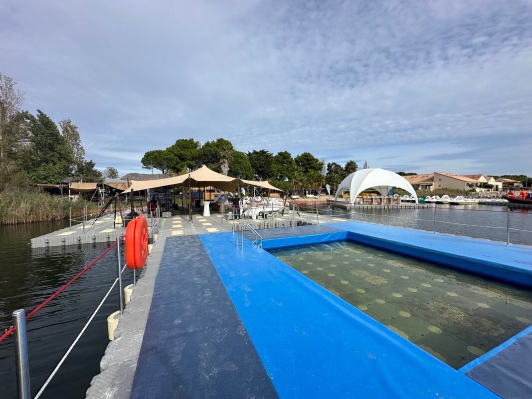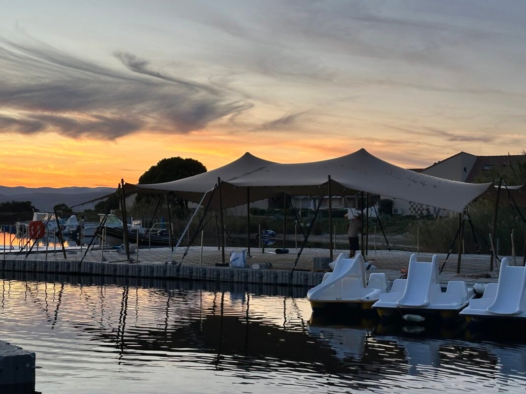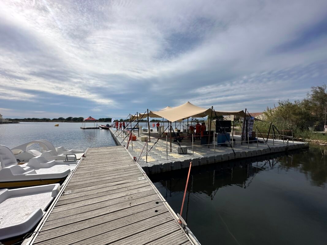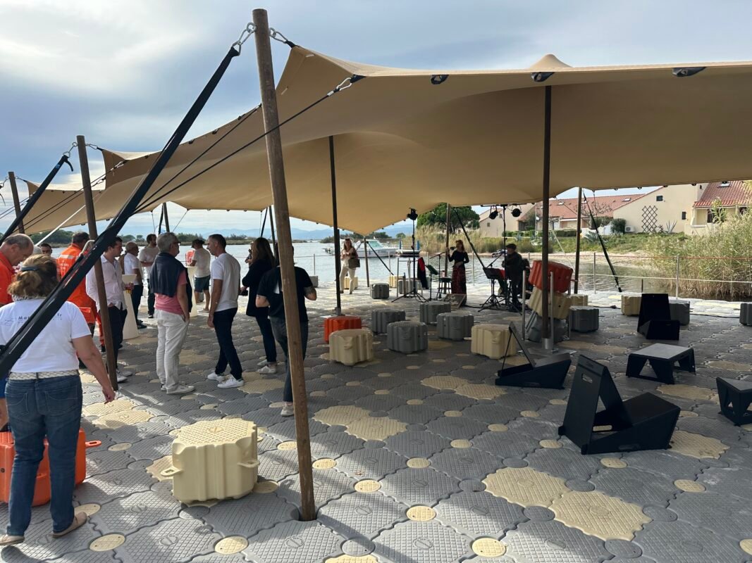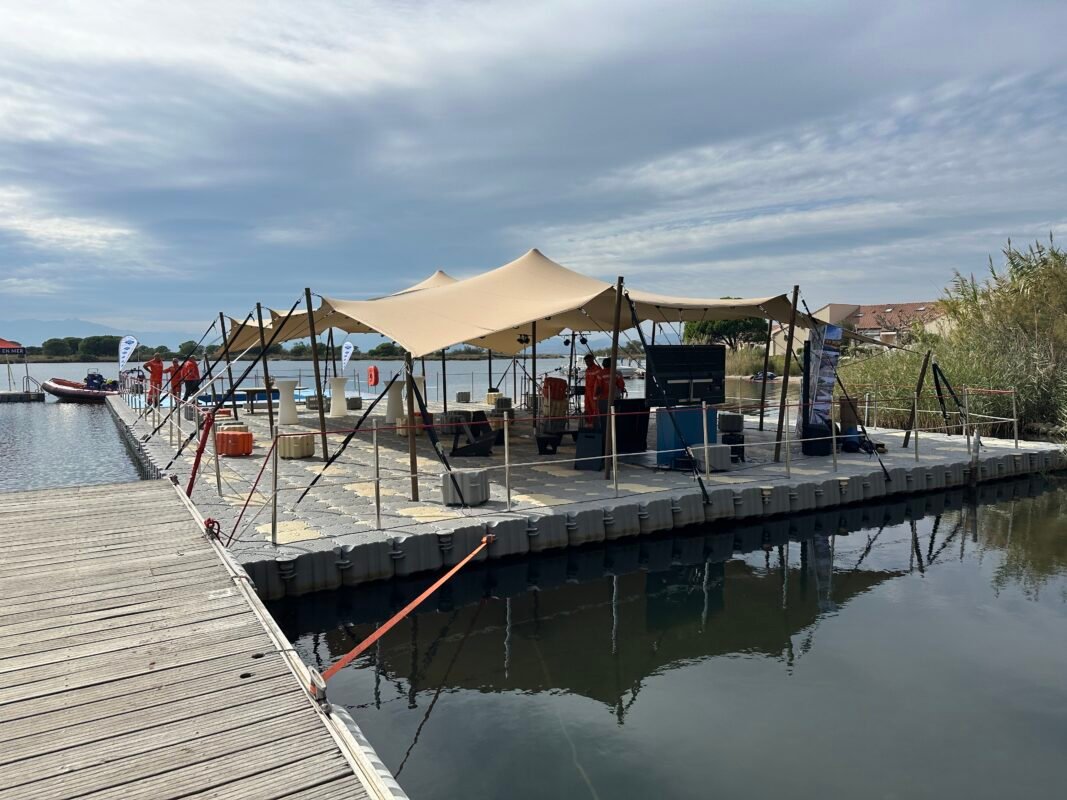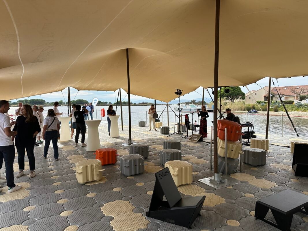 El montaje tuvo lugar en Port Leucate, Francia, un enclave natural rodeado de agua y vegetación. El principal desafío fue instalar una carpa stretch sobre una plataforma marina, garantizando seguridad, estabilidad y una estética impecable.