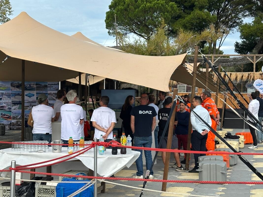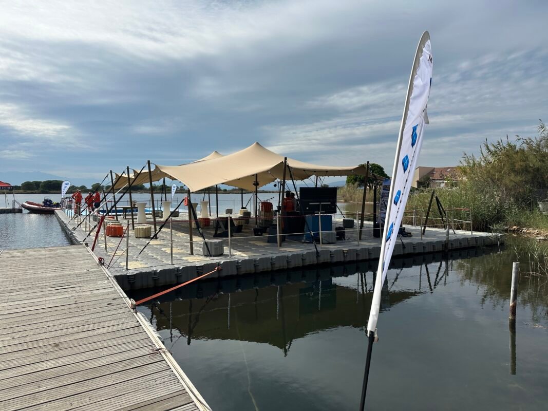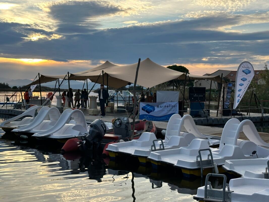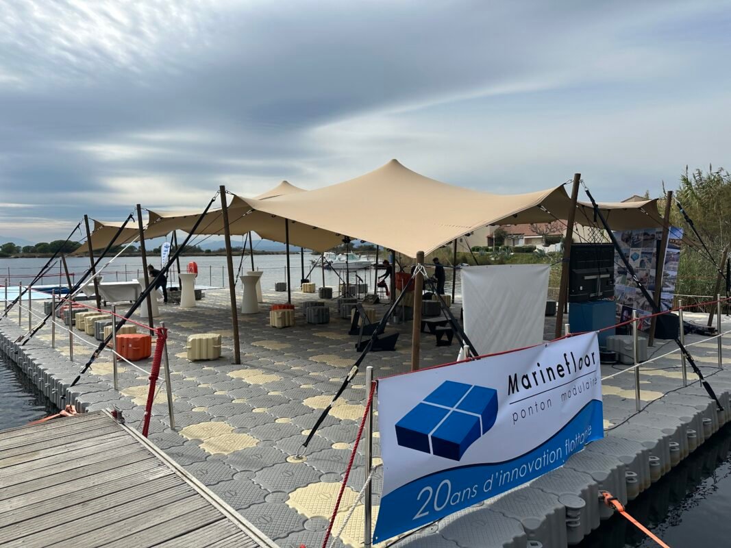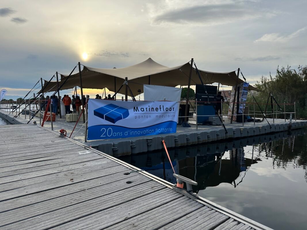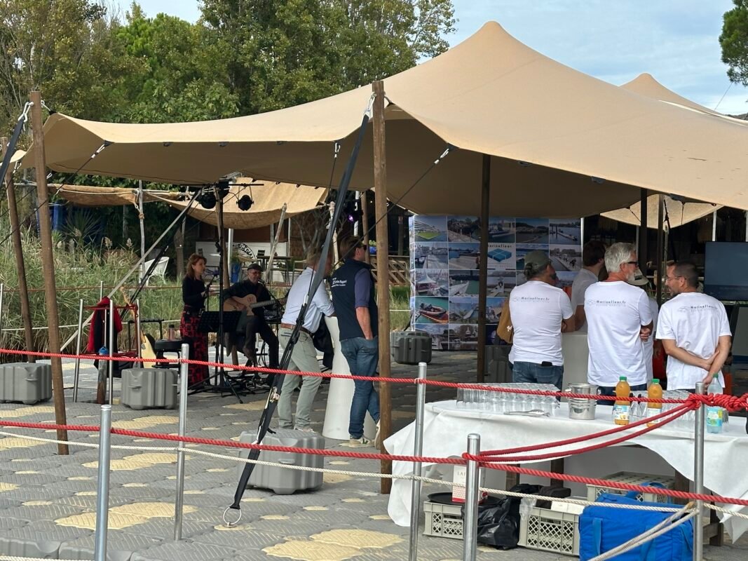 El montaje tuvo lugar en Port Leucate, Francia, un enclave natural rodeado de agua y vegetación. El principal desafío fue instalar una carpa stretch sobre una plataforma marina, garantizando seguridad, estabilidad y una estética impecable.