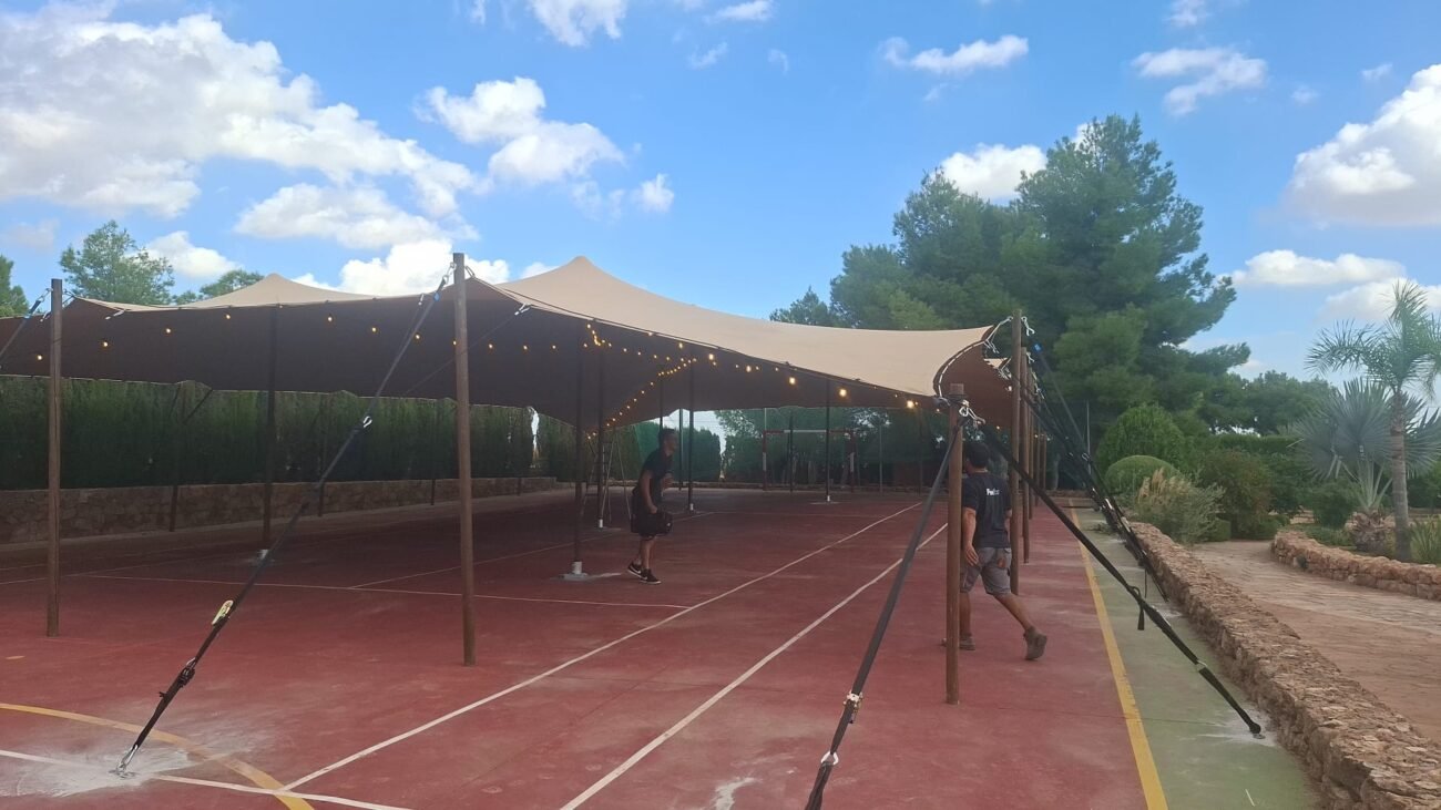 Su versatilidad permite cubrir espacios de distintas dimensiones, ofreciendo sombra y confort sin perder luminosidad ni ventilación. En este caso, el montaje se diseñó para albergar la zona del banquete y el área de baile, creando un entorno funcional y sofisticado para los invitados.
