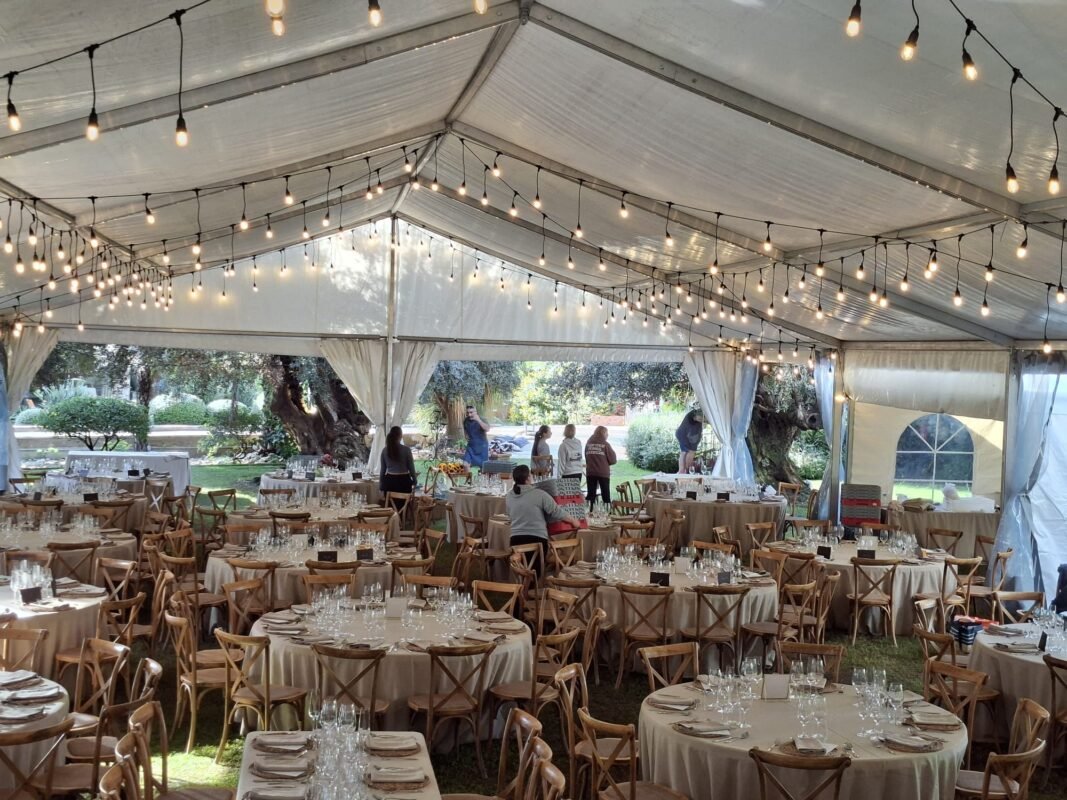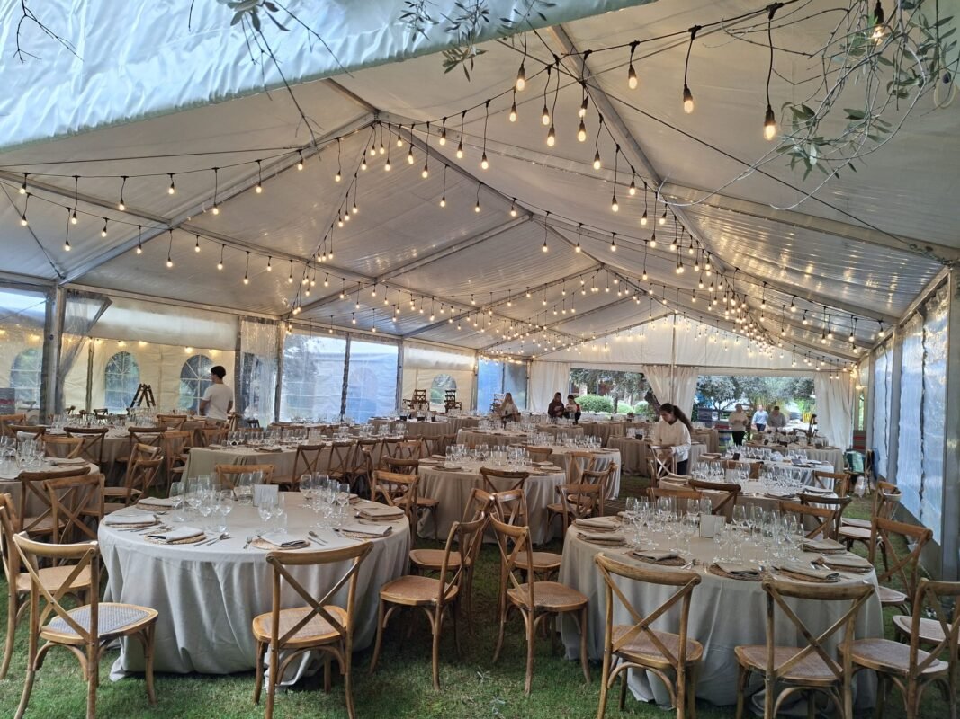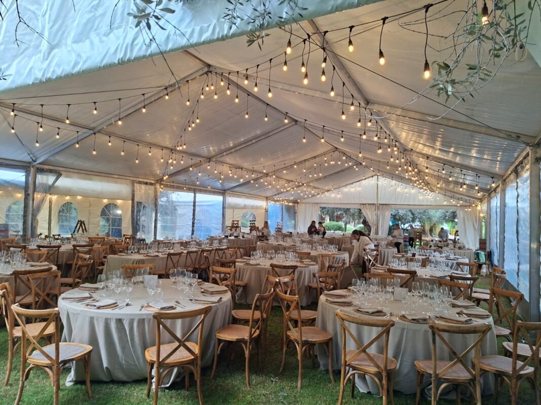 Bajo la sombra de los olivos, los invitados disfrutaron de una jornada inolvidable. La carpa transparente permitió aprovechar al máximo la luz natural durante el día, mientras que, al caer la noche, la iluminación ambiental realzó la belleza del entorno y la elegancia del montaje.