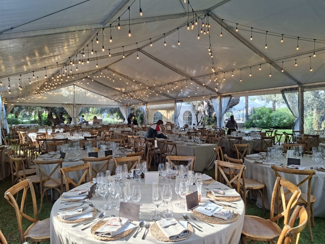 El evento se desarrolló en una finca rodeada de olivos y vegetación autóctona, donde las jaimas de techo cónico y las carpas transparentes se integraron de manera armoniosa entre los árboles. La disposición de las mesas y la decoración natural potenciaron un ambiente cálido, íntimo y distinguido, perfecto para bodas, comuniones y eventos exclusivos.
